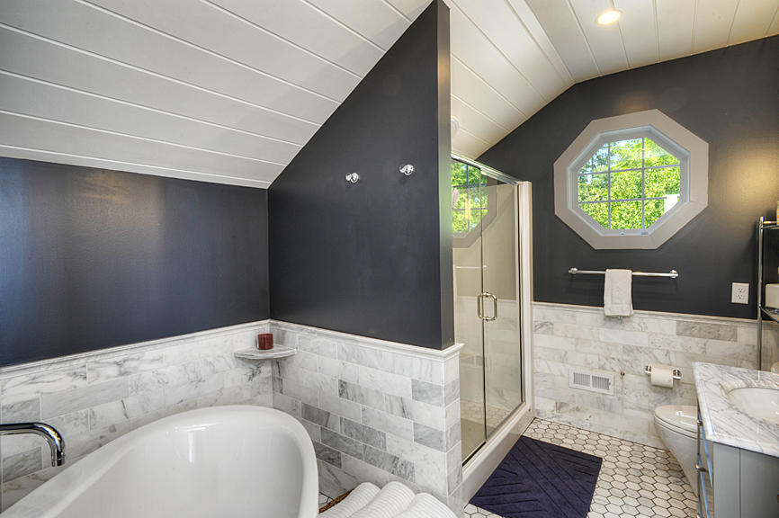- First floor primary suite with vaulted bead board finished ceiling, and spacious bathroom with heated floor, his and hers vanities and walk-in shower.