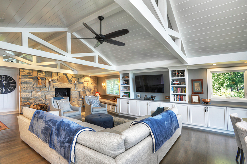 - Grand family room with vaulted ceiling, exposed trusses and fireplace with fieldstone feature wall.