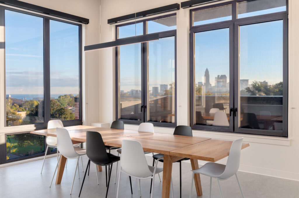 Amenity room at the northeast corner of the 4th floor, complete with a walkout deck offering panoramic views of the Cleveland skyline and Lake Erie.