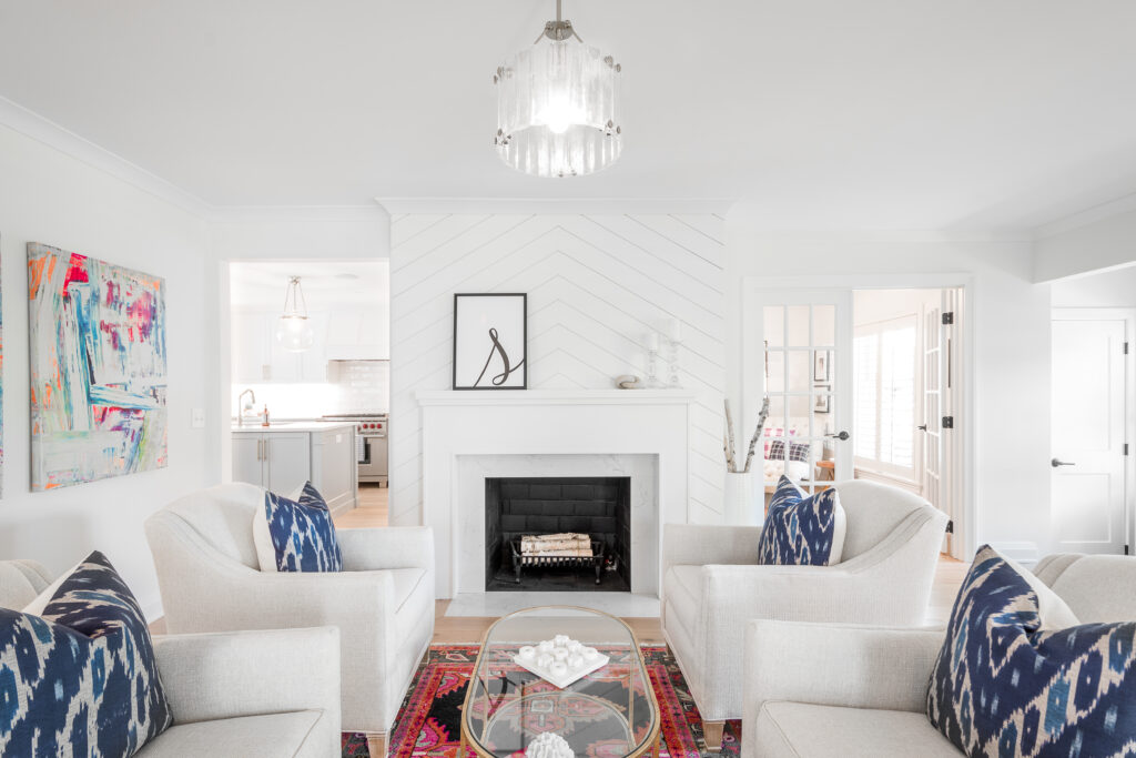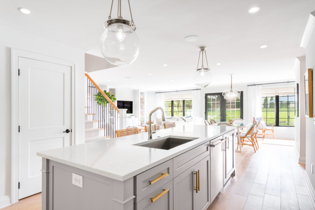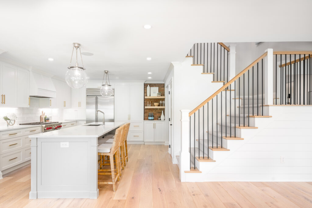 Upon entering, guests are welcomed by a formal living and dining room, along with a private office. These spaces flow seamlessly into a thoughtfully designed family room and an expansive, open-concept kitchen—together forming the heart of the home. This gathering space is anchored by a striking new staircase leading to the second floor.