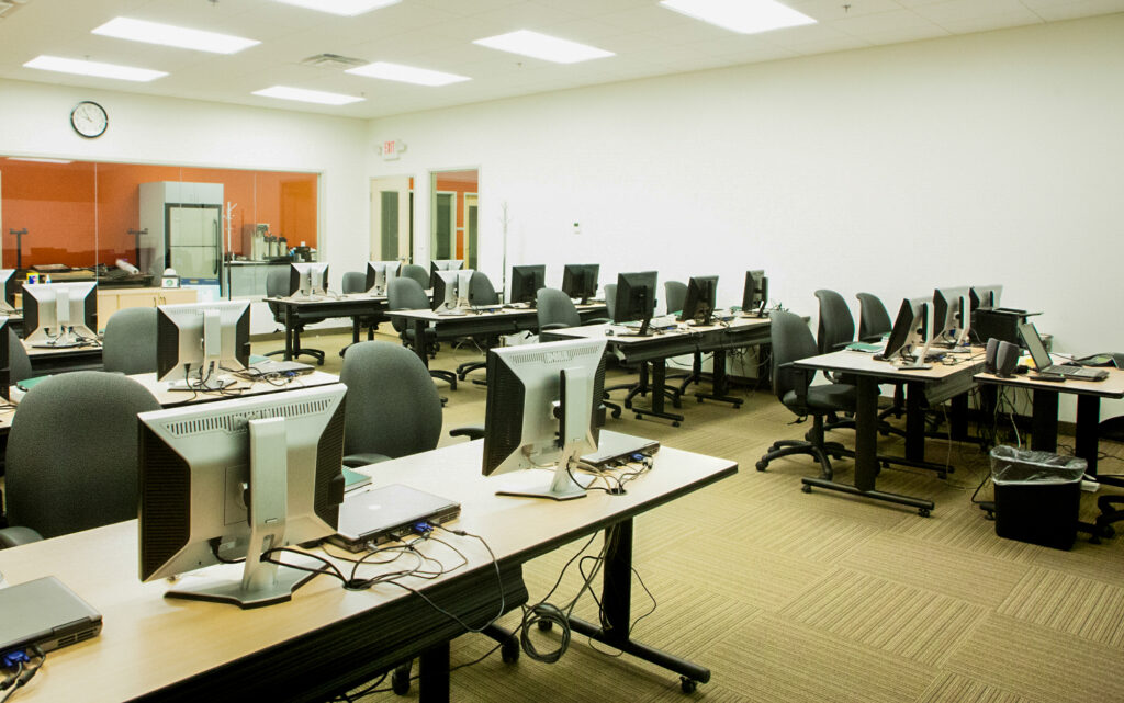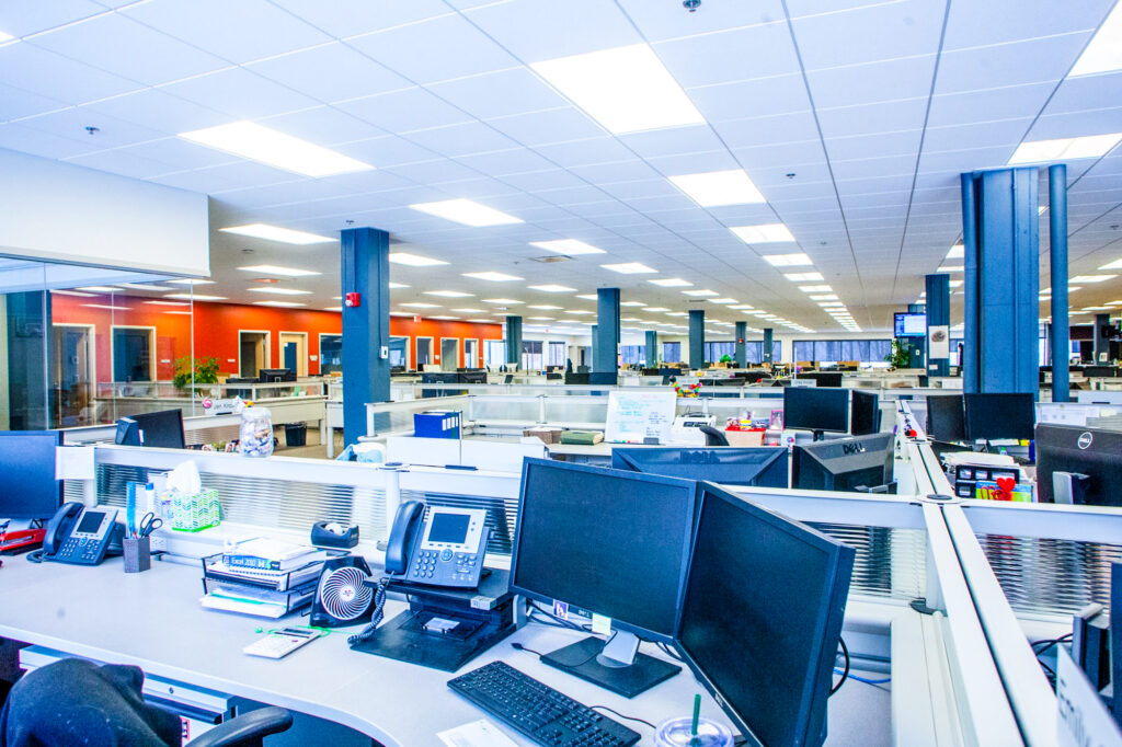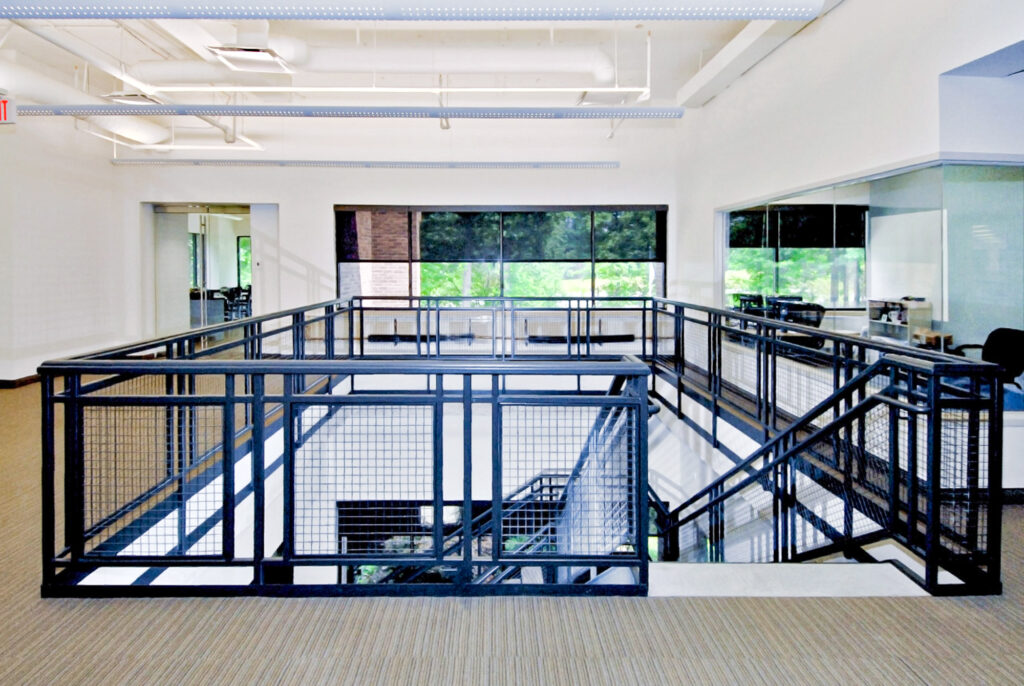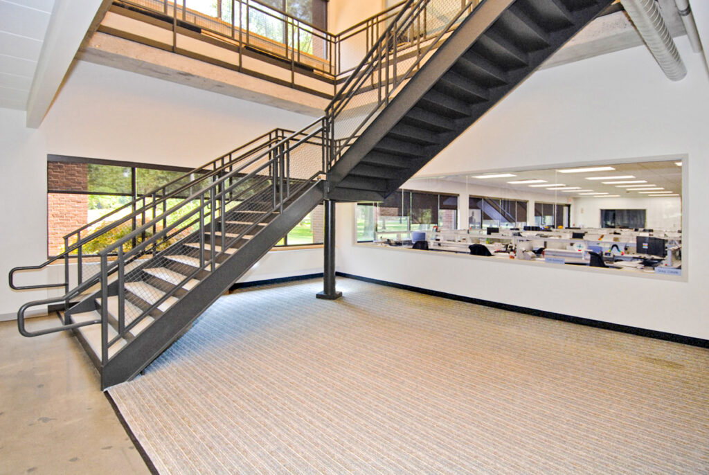 Phase 2 involved a comprehensive renovation of the building’s lobby, which was enhanced with a striking two-story monumental steel staircase. The second floor was expanded to include 150 workstations, 15 offices, 5 huddle rooms, and a vibrant cafĂ©. The basement was also transformed, with the addition of group training rooms, as well as audio/visual and recording studios.