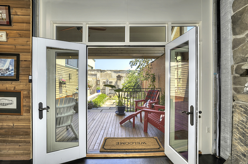 - A professionally landscaped enclosed courtyard, complete with Ipe wood deck, mounted deer head, and water feature.
