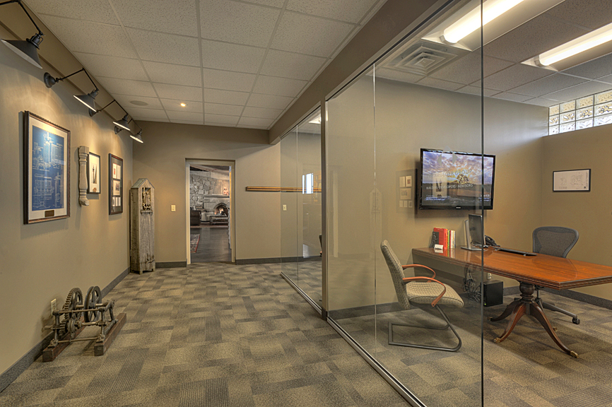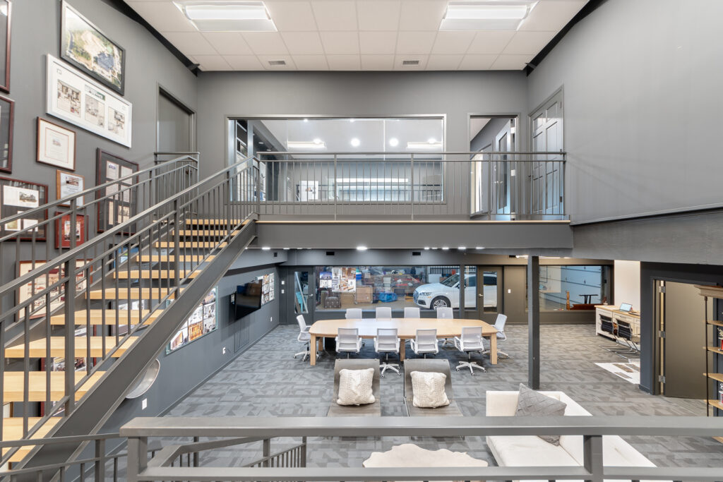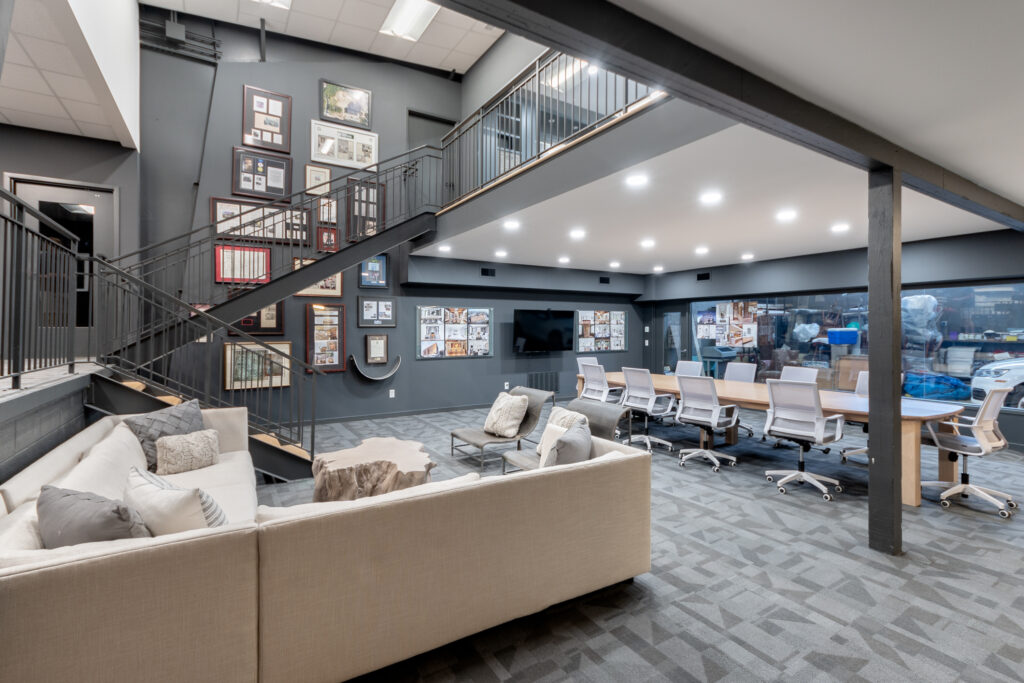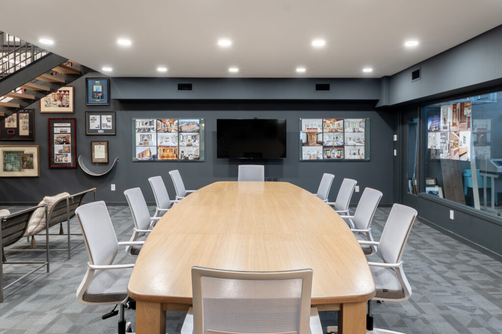 The Krueger Group built a conference center in an adjacent warehouse space that incorporated salvaged architectural materials and mementos from past projects into a space celebrating our past while supporting a culture of openness and creativity.