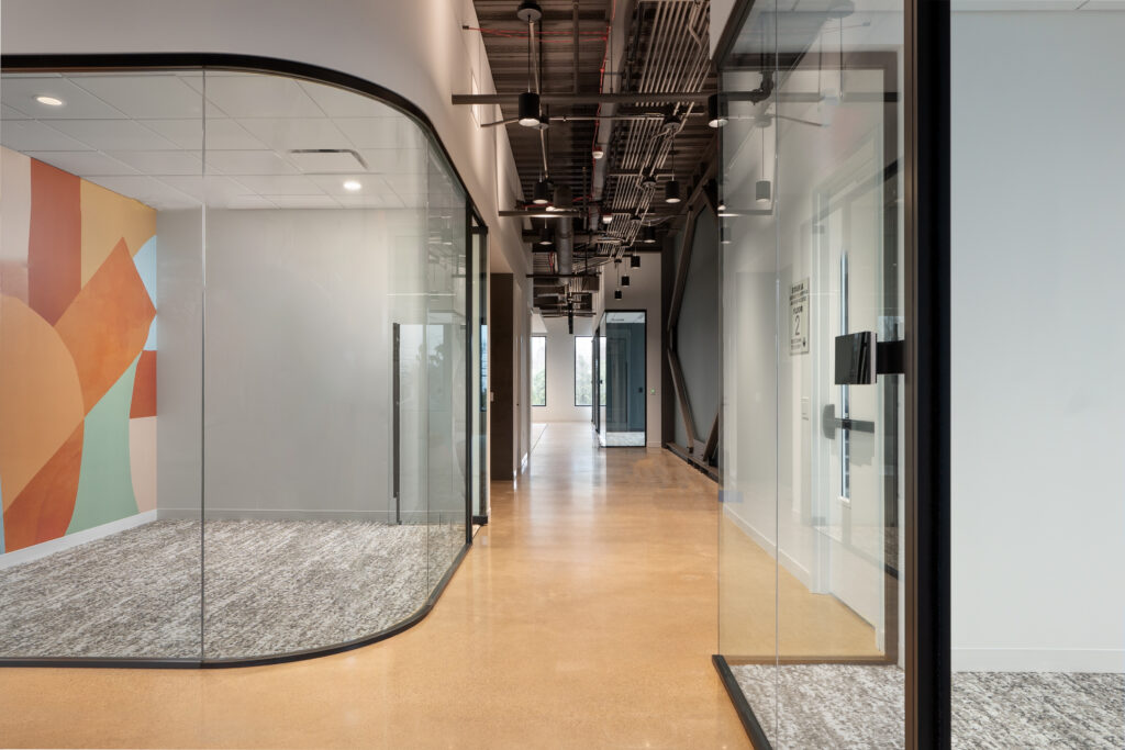 Glass partition walls with frameless full glass pivot doors at all offices and conference rooms including curved glass systems at select conference rooms and phone booths.