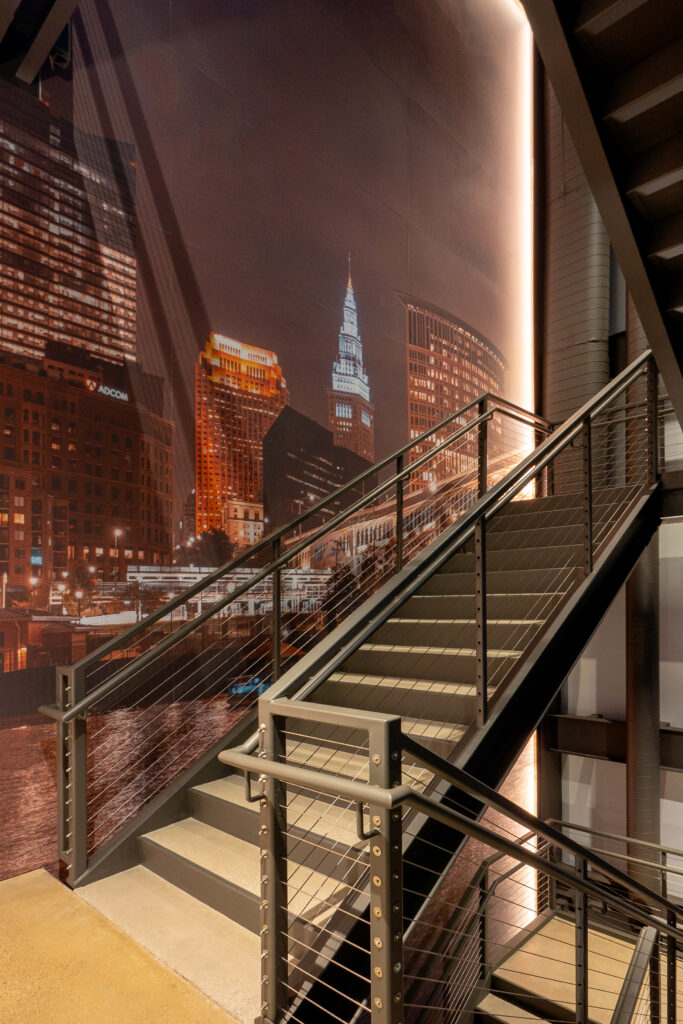 Monumental staircase with 3-story mural of the Cleveland skyline that is visible at night.