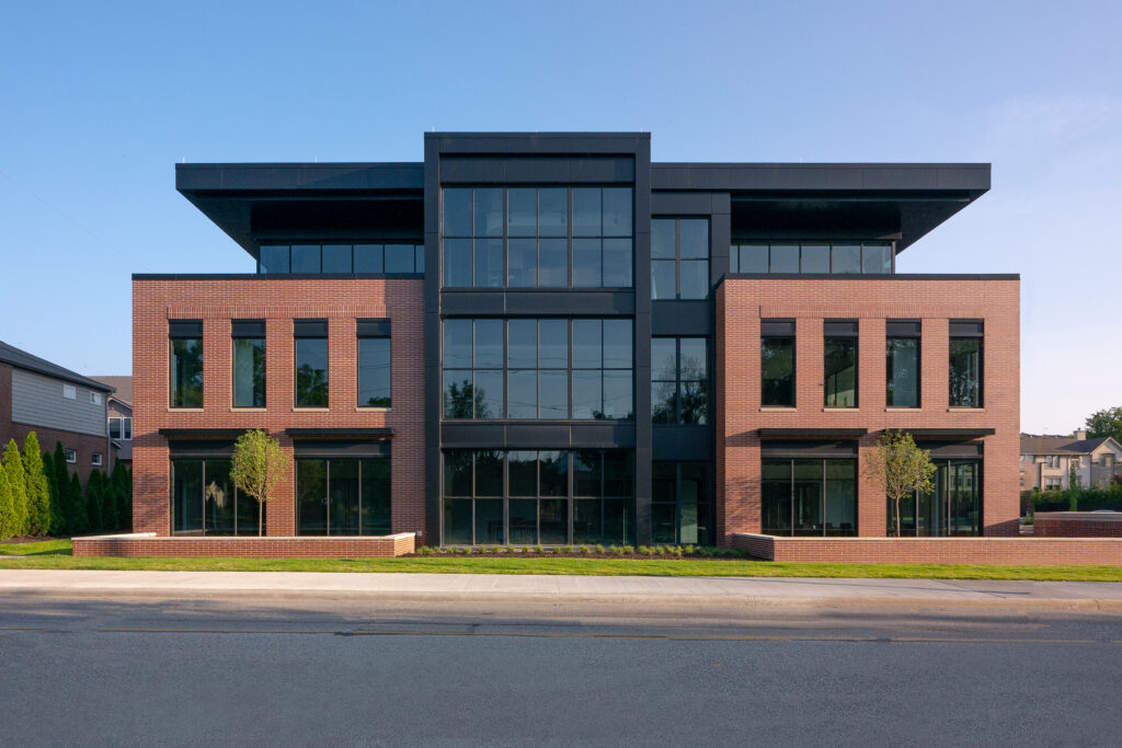 Exterior finishes of ACM paneling and crisp edged and faced, deep red Norman brick laid in running bond pattern.